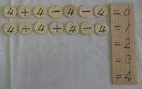 数字の4を四個並べ、その間に+・−・×・÷の計算記号を置いて、0から9までの式を作るものです。先ほどの遊びとほとんど同じになります。計算記号のほかに( )を使うことや、4を2個使って、44とすることも可能です。小中学生が対象ですから、分数形や√は使いません。