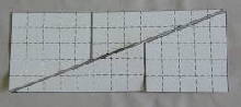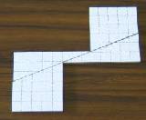 マス目がついた紙を、正方形の板に貼りました。この状態で、面積は8×8=64です。これを長方形に並べかえると、5×13=65となります。板の切断も正確ではありませんが、対角線もはっきりしないのです。このタイプの問題は、正確に作ると答えがわかります。中学校の数学教科書にも掲載されていました。一次関数の傾きの学習で、生徒にさせると楽しいかもしれません。