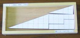 次は並べかえると、穴あき三角形になるというものです。三角形の高さ5は同じですが、板の切断の誤差が大きくて失敗したようです。板に貼った紙にも誤差があるようです。参考図書には長方形で問題が作られていたものもありました。