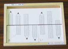 こちらの問題は、下2枚を入れかえます。そうすると、鉛筆が6本になります。鉛筆の数は変化しても、変わらないものがあります。それは、鉛筆の長さの合計です。上下の絵で、鉛筆のない空白部分があります。そこを一致させると、鉛筆が1本減るのです。