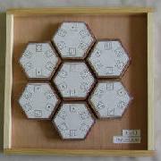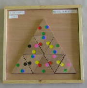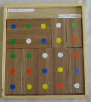 色を合わせる問題でなく、合計数を合わせる問題になっています。正六角形七枚の板には、サイコロの目が書いてあります。隣り合う辺の目が合計7になれば、完成したことになります。小中学生には難しいので、中央の一枚だけボンドで貼っています。それでも正解を得るのが難しかったらしく、人気のない教材だったといえます。