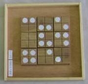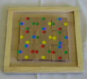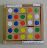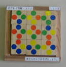 色あわせと同じく、正方形を利用したパズルです。ただし同じ色をそろえるのでなく、点(シール)の数をそろえます。写真が正解を示していますが、縦・横・対角線2列に点3個が並ぶようにします。一枚の正方形には補助線があり、四等分されています。ですから、一枚の板も四通りの向きを考える必要があります。