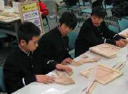 写真8は、中学生がタングラムに挑戦している場面です。この教材はほとんど30cmの箱に収められています。箱から出して指示された形を作りますから、机が広くなければなりません。箱の中で遊べるタイプと、箱の外で遊べるタイプに分かれます。タングラムの特徴は、問題数(特定の形)が多いことです。子どもたちの移動を考え、提示した問題は4〜6個としました。
