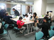 写真6は、ビデオ視聴のコーナーになります。秋山仁先生のビデオを投影していたのですが、ここに座る子どもはほとんどいませんでした。応援に来てくれた校長先生たちが、よく見ていました。ここには15個の椅子を用意しました。私の考えでは、疲れた保護者がここで休憩をするだろうと思ったのです。しかし、保護者は我が子と一緒に座り、パズルを楽しんでいました。