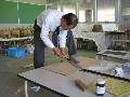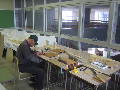 写真4は、二階での糸のこ作業風景です。教材製作は、とにかく切る・磨くの繰り返しになります。一番神経を使うのは、この切る作業です。1mmの線からずれないように、少しずつ板を送ります。