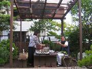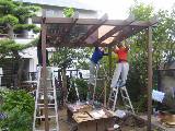 下の写真は、9月9日(水)の様子です。お昼に出勤するときは、三人で基礎の穴掘りをしていました。お世話になりますと言って出かけたのですが、帰宅したら庭のポーチガーデンがほぼ完成していました。組立て式ですから、早いはずです。材質はすべてアルミ製でした。天井には蛍光灯が二つ、柱にはスイッチとコンセントが付いていました。バーベキューだけでなく、鉄板焼きもできそうです。屋根は半透明の板が張ってありました。紫外線を防ぐ材質だそうです。