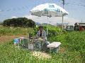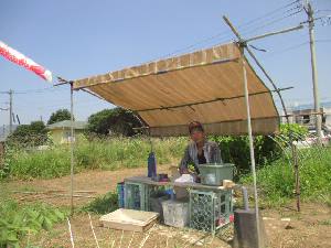 右手に水筒、左手にタバコ、テーブルの上にはおやつとラジオ。東側の畑には、以前からテントがあります。そこは本社ですから、ここは支店になります。写真を見ながらの感想です。神社の祭りでお菓子を売っている露天商のおじさんに見えます。現在67才ですが、75才までは農作業をしたいと考えています。暑さにも負けず、まだまだ働きます。