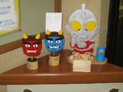 1月末になり、次の二つを作りました。この時期になると、スーパーでも豆とお面がセットで売ってあります。最初はホームページから鬼のペーパークラフトをダウンロードしたのですが、面倒になって捨てました。やはりトールペイントがいいですね。節分の組み合わせは鬼と桃太郎が一般的ですが、今回は正義の味方・ウルトラマンにしました。