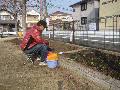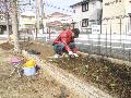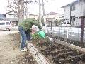 いよいよ花壇作りの開始です。1月13日からショベルとレーキで土をならしながら、余分な土を台車で移動しました。土地が低くなっている場所へ何度も往復しなければなりません。ベンチや遊具の下に運びました。フェンス沿いには木材を並べ、土が用水路に流れないようにしました。13日から三日間かかりましたが、思ったよりも早く済みました。
