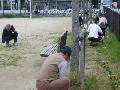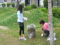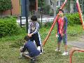 作業をしていたら、子ども会の親子連れや老人会、そして自治会の役員さんが集まってきました。大人の皆さんは慣れていて、フェンス沿いの草取りです。子どもたちには、刈り草を袋に詰めるように頼みました。子どもたちは作業と遊びが一緒になっています。それでも少しずつビニ袋が増えていきました。何人参加しているのだろうと数えたら、35人が作業をしていました。