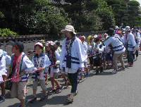 10時50分には公民館で法被に着替えた子どもたちが、神社に集まってきました。総勢85人の小学生と大人が15人ほどのみこしです。熱中症対策として、全員帽子と水筒持参です。11時爆竹を合図に、子どもみこしの出発です。町内をワッショイワッショイ言いながら、みこしを全員で引きます。沿道には地域の方が集まり、封筒に入れたお賽銭を渡します。