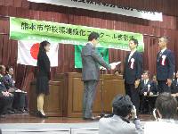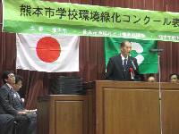 上の写真2枚は、平成27年11月12日(木)に実施された緑化コンクール表彰式の様子です。会場は、熊本市市役所14階大ホールです。出席者は、市内小中学校の校長先生と幼稚園の園長先生です。左の写真は、表彰に先立ち講評をしている私です。市長や報道関係も多いため、やはり緊張します。右は「熊本市賞」を授与する大西市長です。