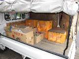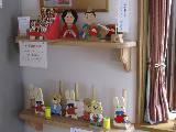 コンテナ5個の中からトールペイントを出し、少しずつ棚に並べていきました。自己紹介のパネルを下げたり、不思議な玩具類も展示したのです。ひな人形も設置して、その横に注文用のハガキも置きました。また、お持ち帰り自由の鉛筆立ても60個ほど置いたのです。2時間ほどで設置が完了しましたが、知人のMさんがやってきて、いつの間にか5個ほどペイントを確保しています。