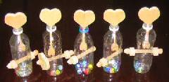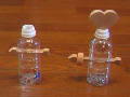 この「取れない矢」を作ったあと、ペットボトルの中に一円玉を入れることにしました。しばらくしてお金はよくないと思い、ビー玉を入れました。細工をする前にビー玉を入れ、そしてハートを通しました。これでビー玉は取れなくなります。一円玉がヒントになり、貯金箱になるようにしたものもあります。倉庫におはじきがありましたから、ビー玉と一緒にボトルに入れて重りにしました。