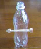 これを発展させることを考えました。それは、ペットボトルを利用するものです。ペプシコーラのペットボトルやウーロン茶のペットボトルを利用しています。矢の形はそのままで、ボトルに合わせて少し長くしました。キーホルダー同様に、細工した木製の矢が通りました。横二ヶ所の穴は、横1.5cm縦1cmとしました。