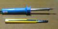 左の写真は、最初に試作したペットボトルの「取れない矢」です。これだけでは物足りません。おもしろくするためには、もう一工夫必要です。 右の写真は、穴あけ用の道具です。切り口はカッターナイフで開けた方がきれいですが、何度も焼かなければなりません。 |