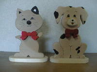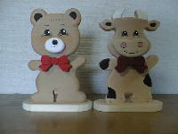 トールペイントというわけではありませんが、初期の頃の作品です。動物シリーズで完成したのです。木は、すべて版木です。結構、高価な作品になってしまいました。高さは15cm位に統一しています。新聞折り込みの絵を元にして型をつくりました。