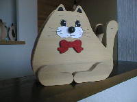 最後のネコは、テープカッターになっています。俊彦くんのために作ったのですが、いつのまにか、部屋から追い出されていました。休みの日に苦労して作ったのに、子どもは親の苦労を知りません。鼻には木球を利用しました。