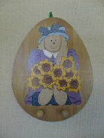 この作品も、壁飾りです。スイセンを持ったうさちゃんの絵は気に入りましたので、いくつも作りました。この絵はコリーン・ミラーさんのデザインです。山北小学校にはスイセンの花を何百と植えています。早春に咲くかわいい花です。