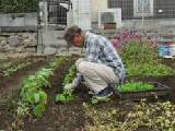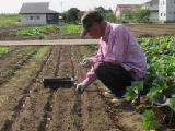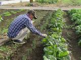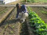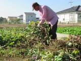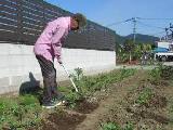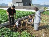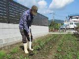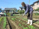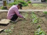 ここは葉物野菜の場所として、少しずつ耕しています。畝の幅は90cmで、2種類の種をまいています。草取りをしたり、肥料をまいています。発芽は順調で、9月下旬には本葉も確認できました。