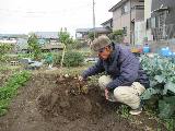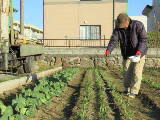 見事に発芽しました。混み合っているので、10月6日に1回目の間引きです。2〜3本にしました。肥料をまいて土寄せしました。12月6日から収穫開始です。もちつき大会でのトン汁用に提供しました。