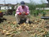 ヒロセで11月21日に購入しました。1束100本で600円でした。3束の2000円ほどかかりました。12月12日に肥料。草が目立つようになりました。草取りを始めました。1月24日に肥料。2月3日に草取り完了。4月上旬から少しずつ球が大きくなっています。4月下旬から数個だけ収穫しました。5月1日に10個収穫しましたが、茎が倒れていません。5月31日に半分ほど収穫しました。土が固いうえに根が張っているので、スコップで掘ります。6月2日に収穫完了です。根と茎を切り落とし、畑で乾燥させています。6月中旬には自宅に持ち帰りました。