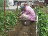 4月6日にダイキで購入した苗です。1ケース28株の1764円です。植えたあとに、盗難防止用に防球ネットを張りました。ときどき苗を盗まれます。4月11日に20本ほど支柱を立てました。4月15日に肥料。5月11日に肥料。5月12日に脇芽を処理して草取り。5月17日にひもかけ。5月27日に肥料。6月5日に脇芽と下葉を処理。6月中旬から少しずつ収穫しています。一度に10本以上採れるときがあります。6月16日に肥料。6月22日にロープ4本を張りました。6月下旬からひもかけをしています。