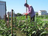 キュウリ エンドウのあとには、パイプ間に5株ずつキュウリを植えました。35株が必要です。畝C。 5月9日植付け