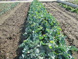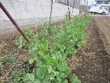1月28日にパイプを立てました。一列に7本必要です。2月上旬に倒伏防止のロープを3列張りました。2月11日に肥料をまきました。種まきが早すぎたせいか、数株が寒さで枯れました。