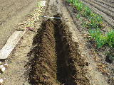 畝Cは一度耕しましたが、そこに穴を掘りました。隣には処分したダイコンがあるので、それを埋めるためです。常に1列の穴を確保したほうが野菜くずの処理に便利だと感じます。毎日のように穴を掘っていますが、体力がないので少しずつになります。ダイコンが済んだあとは、ブロッコリーの茎と葉を埋めています。2月下旬に穴の半分だけ土を戻しました。