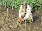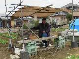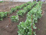 1月28日にパイプを立てました。一列に7本必要です。2月上旬に倒伏防止のロープを3列張りました。2月11日に肥料をまきました。種まきが早すぎたせいか、数株が寒さで枯れました。3月に入って、茎が伸びてきました。3月下旬から一気に茎が伸びたので、ひもかけをしました。アブラムシがいないか確認しています。