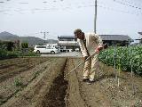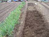 2月5日に畝3列を耕しました。3月15日に空き畝に石灰をまきました。畝2列に牛糞をまきました。