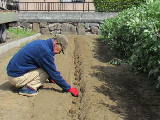 サトイモ 昨年の親イモを植付けました。ここは穴を掘った畝ですから、どうならかわかりません。畝C 3月30日植付け