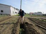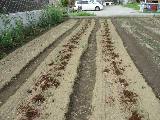 10mの長い畝にメークインを1列です。芽が出るまでには時間がかかりそうです。ネコが糞をして、土を掘るので困っています。3月末に数株芽が出ていました。