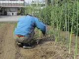 収穫後の茎の処理が大変ですが、好きな野菜ですから頑張ります。寒さに耐えています。ツボミが見えます。2月10日に肥料をまきました。3月18日からひもをかけて倒伏を防いでいます。今年はソラマメの生長が例年よりも早いです。しかもアブラムシをみかけません。早すぎるのを承知で、4月15日に初収穫です。美味しかったです。