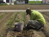 10mの長い畝にメークインを1列です。芽が出るまでには時間がかかりそうです。ネコが糞をして、土を掘るので困っています。3月末に数株芽が出ていました。4月16日に肥料をまいて土寄せしました。イモが顔を出すと緑色になりますので、もう一度土寄せをしたいと思います。