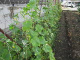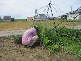 6月14日に3本目の支柱を立てました。翌日ひもかけをしました。6月17日に10本収穫して長男の嫁に届けました。6月下旬も順調に収穫しています。6月24日に草取りしました。6月25日に肥料。7月15日に肥料をまきました。茎が伸びたので7月18日にひもかけをしました。多いときは20本以上取れます。