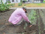 センニチコウ ポットで育てた花苗を移植しました。白とピンクをそれぞれ1列ずつです。畝@ 7月8日定植