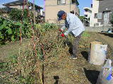 8月1日に枝を切り詰めました。秋ナスを収穫するためです。8月11日からの長雨のために、数株の葉が萎れました。元気がありません。9月9日にひもを切りました。9月10日からナスの枝を切り刻んでいます。9月13日に枝の処理は完了です。これから枝を袋に詰めたり、根を掘ったりします。パイプの整理もしなければなりません。9月15日に一応終わりました。翌日に根を掘り上げました。