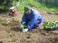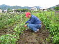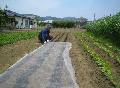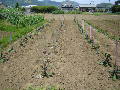 キュウリ 種から育てた苗を、25株ほど定植しました。育てばいいのですが。草刈りをして耕しながら、苗を植えるのです。地這いキュウリですから、本当はワラを敷かねばなりません。(5月14日定植)