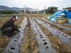 ジャガイモ 1月末にマルチを張り、2月3日に種ジャガを植えました。15kgの種ジャガは二つに切り、しばらく乾燥させました。ちょうど4列になり、収穫が楽しみです。マルチで育てるのは初めてで、植え付けは大変時間がかかりました。しかし、草取りの手間は省けそうです。息子の嫁はイモ好きですから、期待していると思います。(2月3日植え付け)