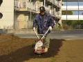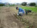 イモを育てて嬉しいのは、収穫のときです。ナスやピーマンと違って、掘ってみるまでは出来栄えがわかりません。私が植えるサトイモは、昨年の親イモを利用します。耕して溝を掘り、イモを並べたあと堆肥と肥料をまきます。そして土をかけて、発芽を待ちます。(3月29日定植)