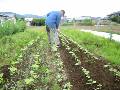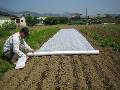 エダマメは発芽したあと、いつも失敗続きでした。それはカラスとハトが双葉を食べてしまうからです。昨年畑に来てみると、まるで爪楊枝が立っている感じでした。カラスが双葉を食べたからです。そこで不織布を購入し、発芽した後も10日間ほど上からかけてみました。とても効果があり、7列のエダマメがすくすくと育っています。(4月12日種まき)