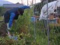 エンドウも収穫が終わりましたが、ネットはそのままにしていました。自宅で育てたツルアリインゲンの苗を定植しました。マメ類の連作になり、すこし心配しています。50株を1列に植えています。(5月16日定植)