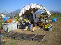 簡易ハウスを設置しています。ここには農具を置いています。収穫した野菜の選別場を兼ね、疲れたときの休憩場にもなります。得意げの写真は、9月23日購入した新しい耕運機です。