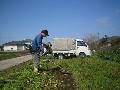 東4 福井農園管理事務所 イモのツルやサトイモの親、刈り草が積まれています。