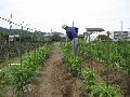 | ナス | ピーマンと同じように、84株を3列に定植しました。虫に食われながらも、どんどん大きくなっています。支柱を立てて、3本仕立てにしました。株の間を耕運機で耕し、土寄せをしました。6月中旬から市場に出せるようなナスが、どんどん取れています。 | 4月2日種まき |