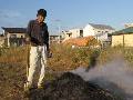 簡易ハウスを設置してます。周辺があまりにも汚いので、10月13日にきれいにしました。一度牛フンを移動して、草を刈りました。そして古いテントシートを敷いて、その上に牛フンとポリタンクを並べました。