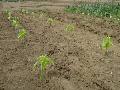 ピーマン 畝を3列を利用して、ピーマン84株を植えました。1列28株です。支柱を立てたり、ひもをかけたり苦労しました。 4月17日定植