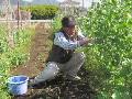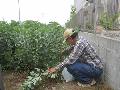 近所のおばあさんが、ソラマメと花を植えています。収穫を待ちます。